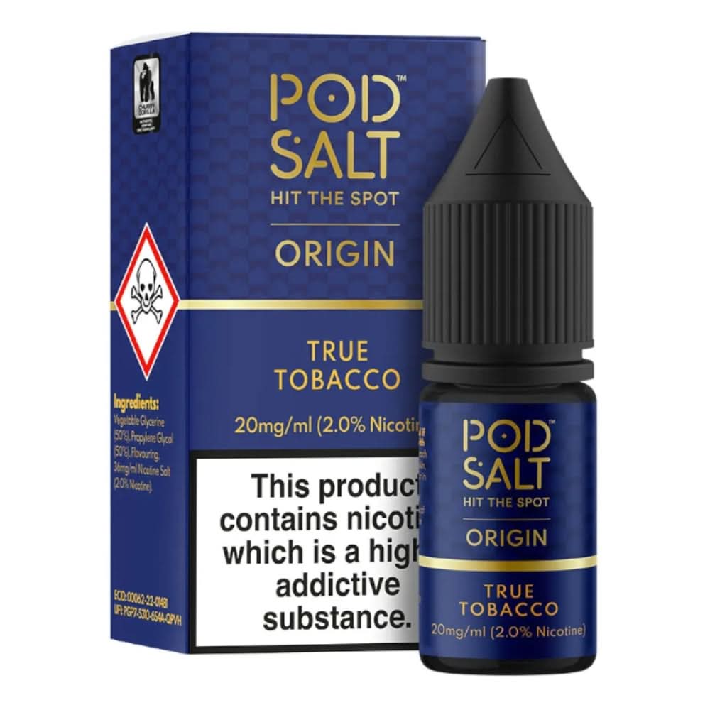The exciting Origin series is a wonderful addition to the Pod Salt E Liquids range, and it gives you six special tobacco flavours to enjoy. True Tobacco would be a great choice from the collection. It boasts a 50VG/50PG base suitable for most MTL devices including pod systems. Available in nicotine strengths of 11mg and 20mg, this juice delivers smooth throat hits and almost immediate relief of your cravings with every puff. Pod Salt True Tobacco Nicotine Salt E-Liquid is: